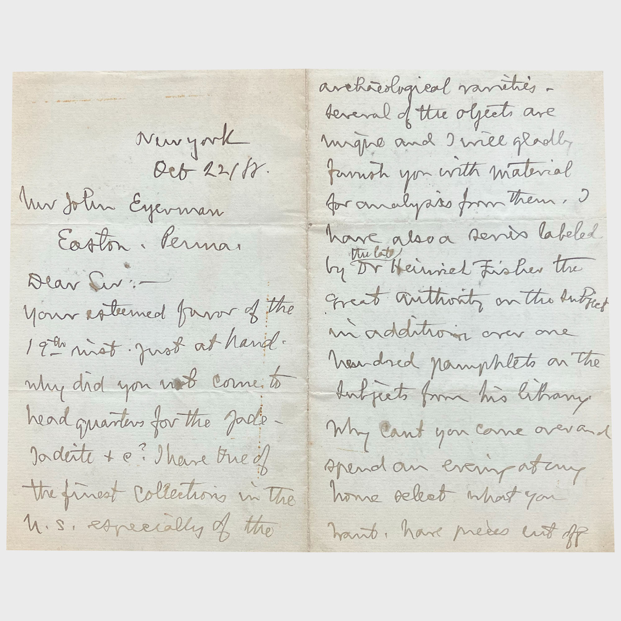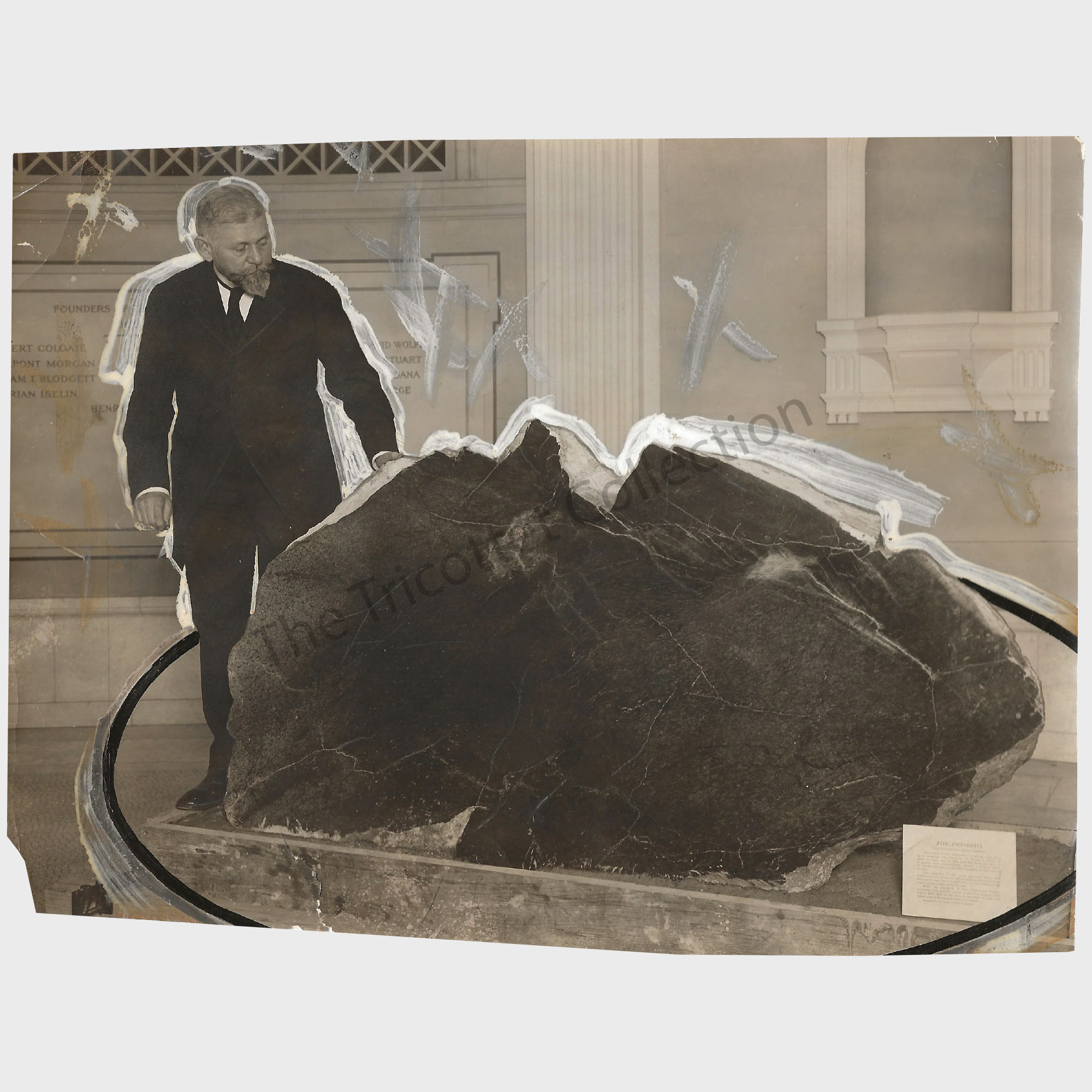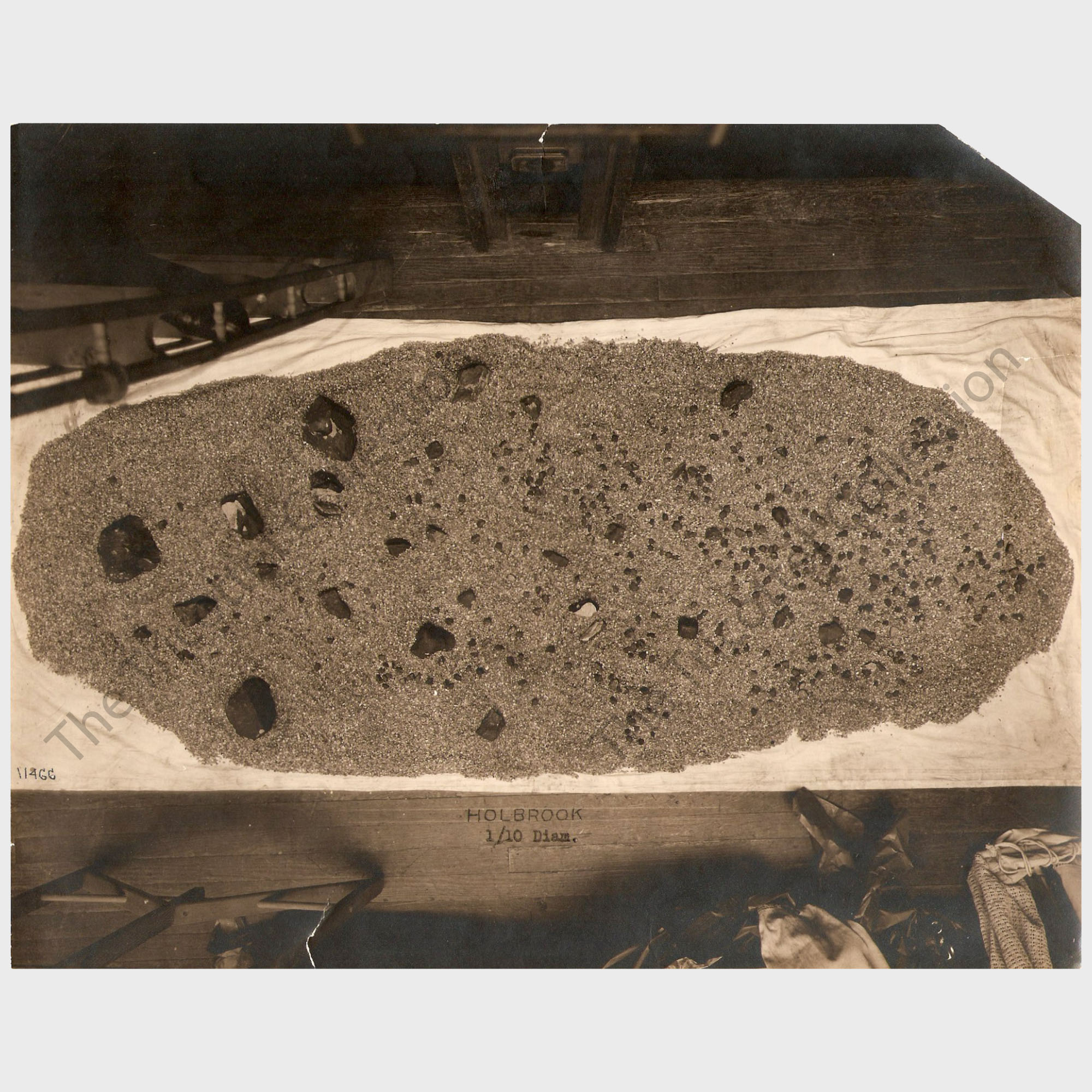 Warren Mathews Foote (1872-1934), son of mineral dealer Albert E. Foote, took over management of his father's business in 1895 and changed its name to the Foote Mineral Company, Philadelphia, in 1900. In meteorite dealing, he is best remembered as being the main supplier of the many thousands of Holbrook stones that fell in 1912 in Arizona, which had just become a US State the same year. He recovered most of the Holbrook meteorite material, including 29 individuals over 1 kg, 6,000 individuals of 1 gram to 1 kg and 8,000 individuals under 1 gram (Foote, 1912a). Holbrook stones were central to his collection and sales stock, as attested by his 1912 catalogue (Foote, 1912b). With so many specimens, Foote was able to do some aggressive marketing, offering specimens in series of hundreds, representative of the strewn field size distribution. Foote had 11 Holbrook series available for sale, from 836 specimens down to 57. He especially mentioned that "no individuals of less than 10 grams nor more than 100 grams [were] sold except in series of 500 grams or more". An astute dealer, he wrote "Because of the low price and great scientific as well as popular interest, three-quarters of the Holbrook fall was permanently distributed as soon as offered in October. Those desiring series should order immediately" (p. 7). In the Foote Collection of Meteorites chapter, we learn that his collection contained some rarities from the S.C.H. Bailey collection (including the original labels), but while constituting "the nucleus and chief excellence of the collection, its greatest individual superiority lies in the series of over two thousand complete boloids from the very recent and most wonderful stone shower near Holbrook, Arizona, July 19th 1912 [...] This suite includes all of the specimens described in the preliminary note [Foote, 1912a] and is among the finest series illustrative of a meteorite shower, to be found in any collection in the world." It is very likely that his Bailey specimens were obtained from a trade with the American Museum of Natural History (AMNH) for the 2,000 Hobrook stones that became part of the museum collection (Reeds, 1937).