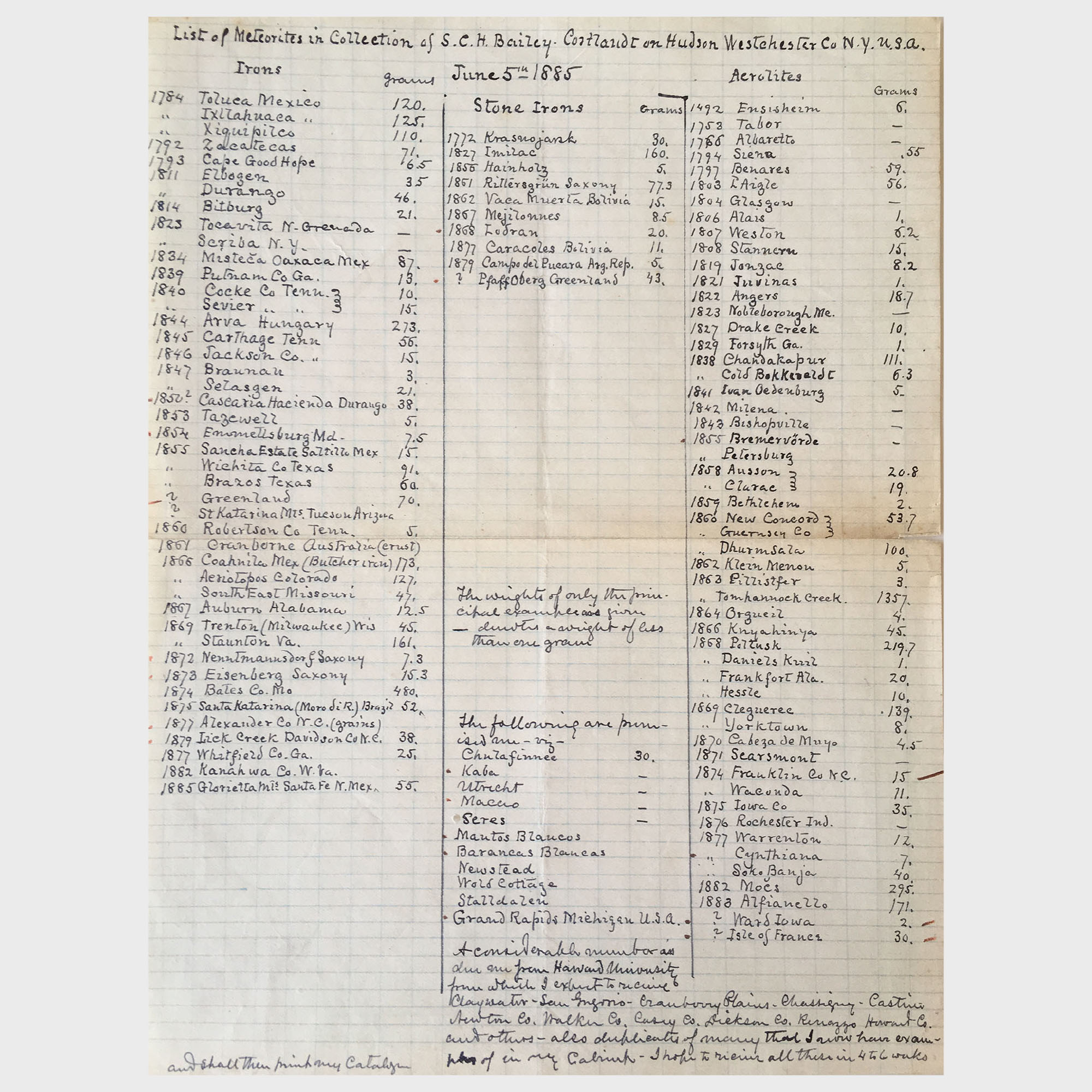 - Bonhams (2007), Historic Meteorites and Related Americana. Sunday October 28, 2007 New York. New York: Bonhams & Butterfields Auctioneers, 47 pp. [in coll.]