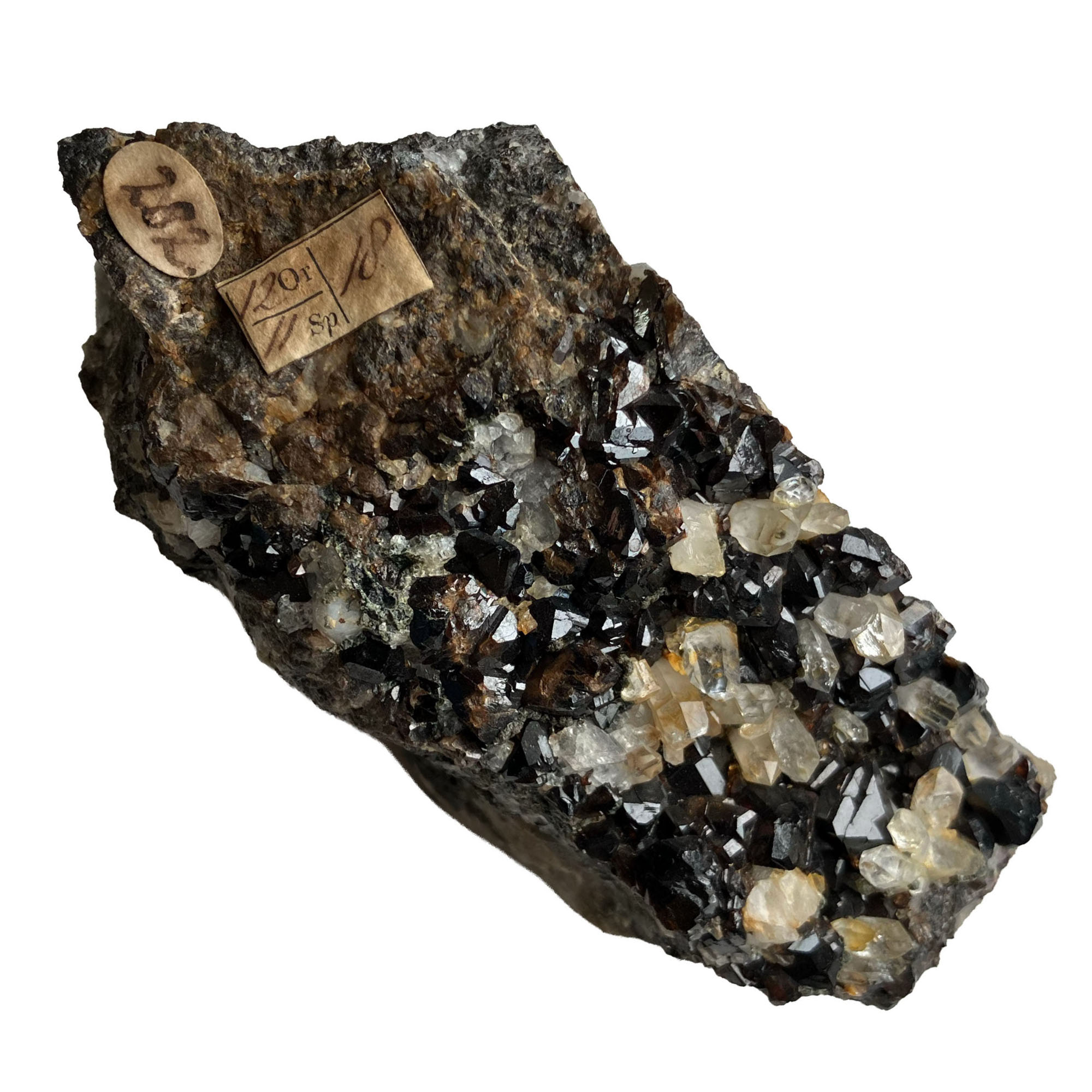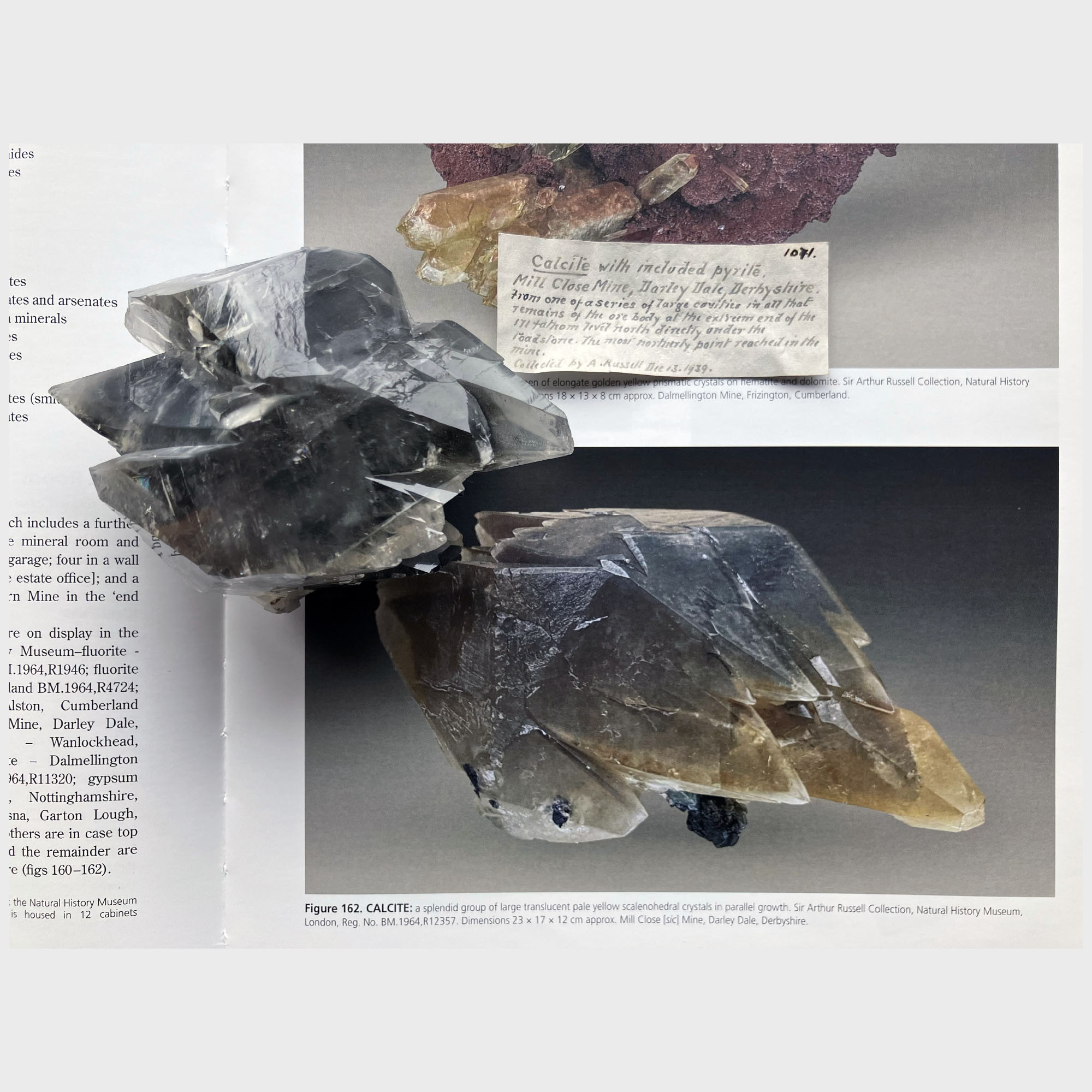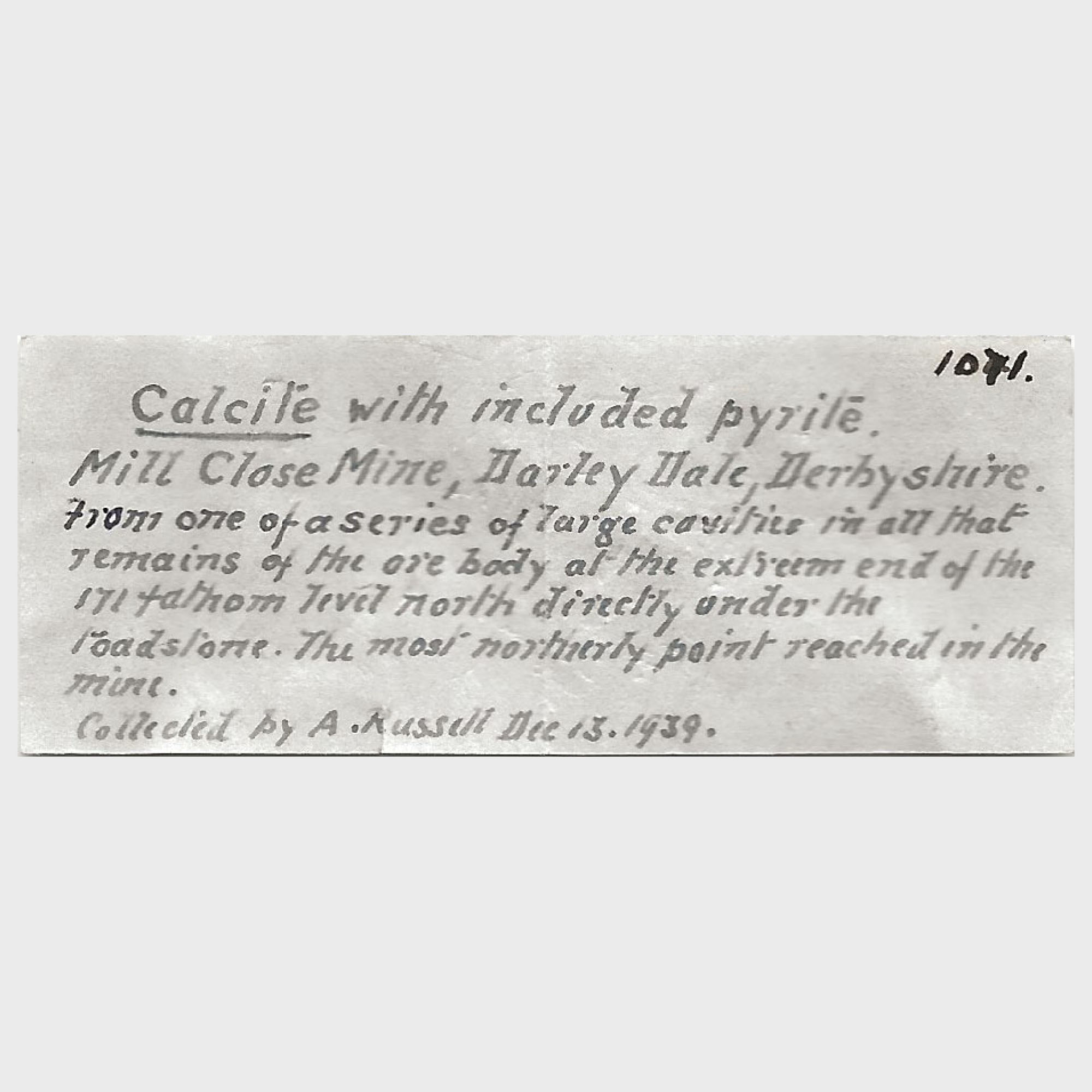 With Sir Russell's detailed handwritten label: "Calcite with included pyrite. Mill Close Mine, Darley Dale, Derbyshire. From one of a series of