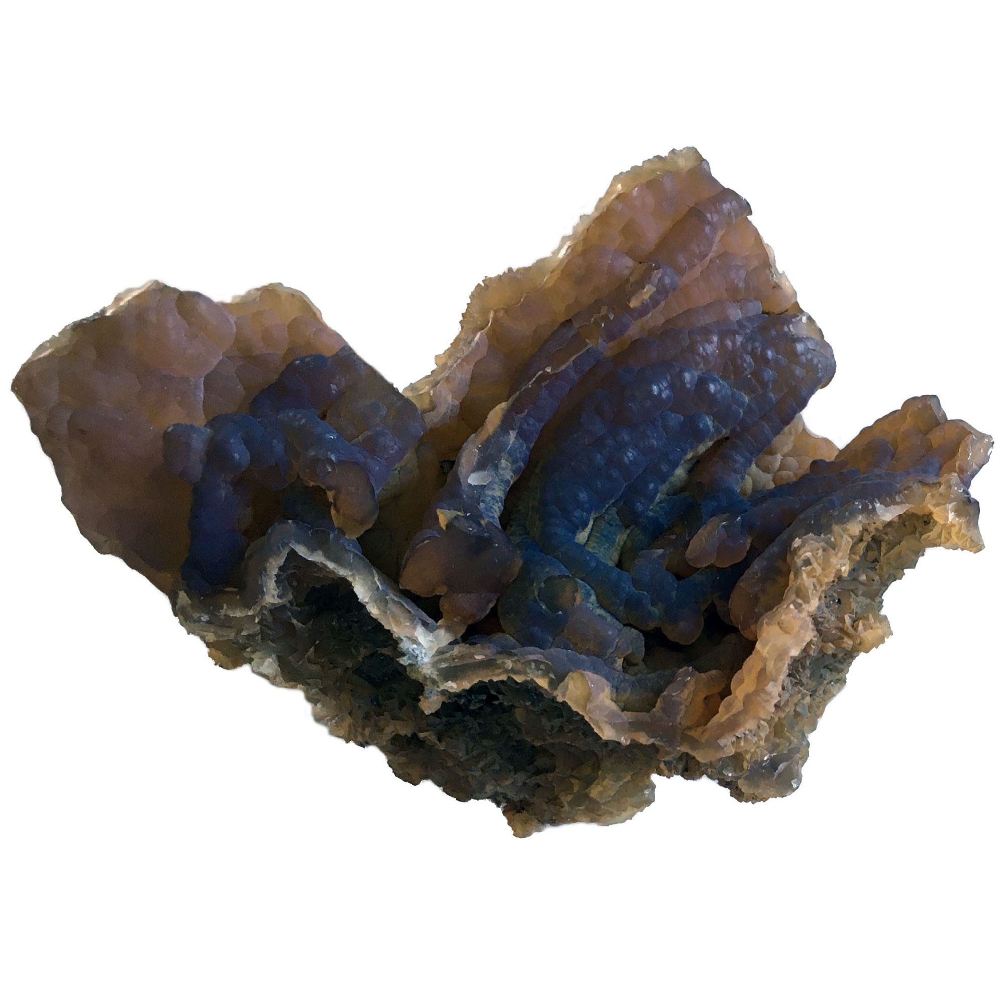 Description: Cabinet-size specimen representing a complex translucent, orange-brown, botryoidal growth pattern augmented by a silky
