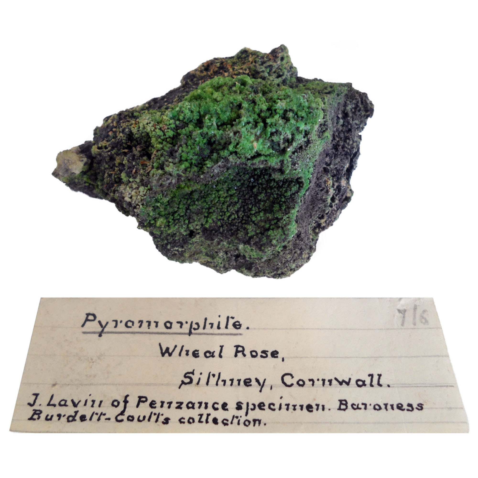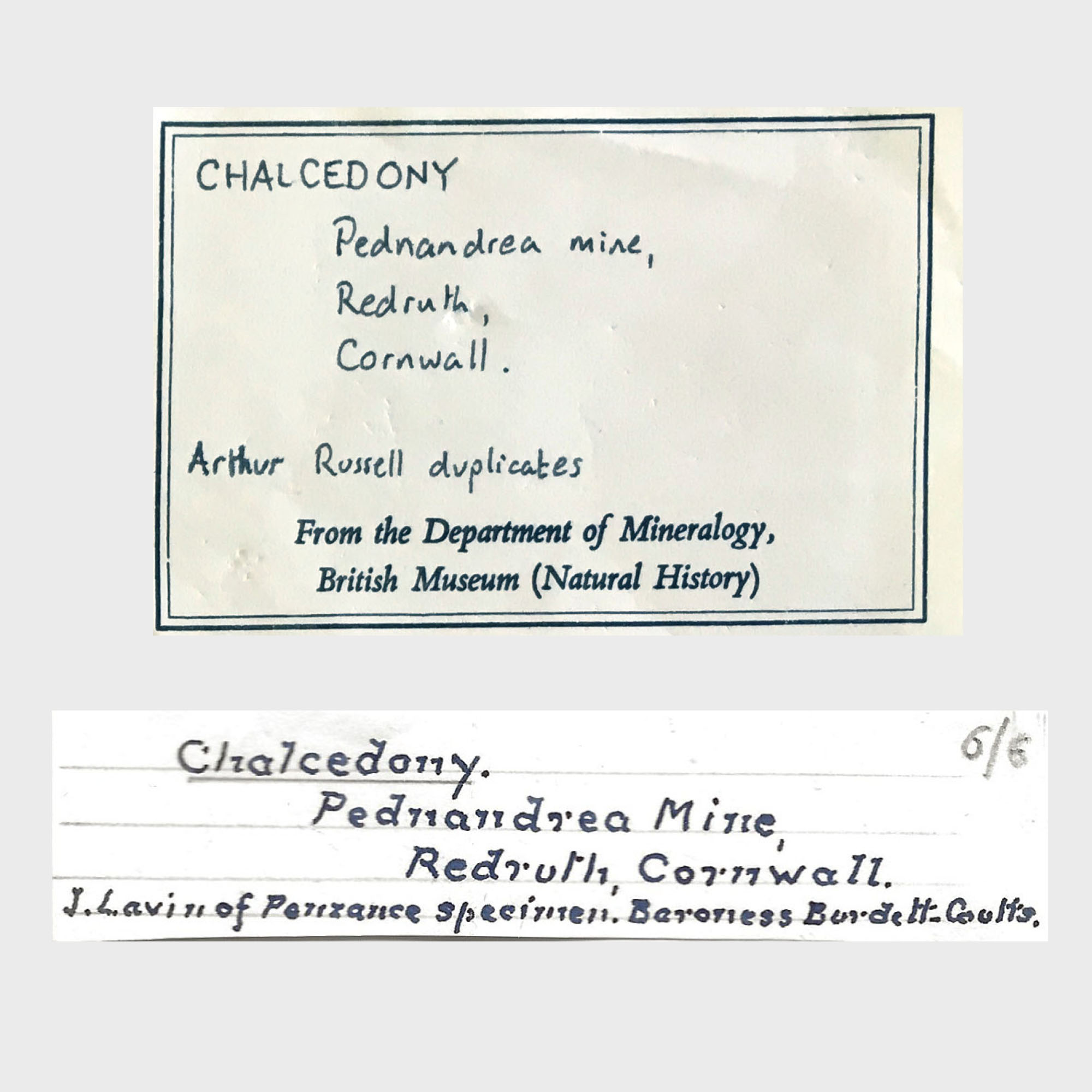 Cornwall. J. Lavin of Penzance specimen. Baroness Burdett-Coutts" and modern British Museum (Dept. of Mineralogy) label indicating "Arthur Russell