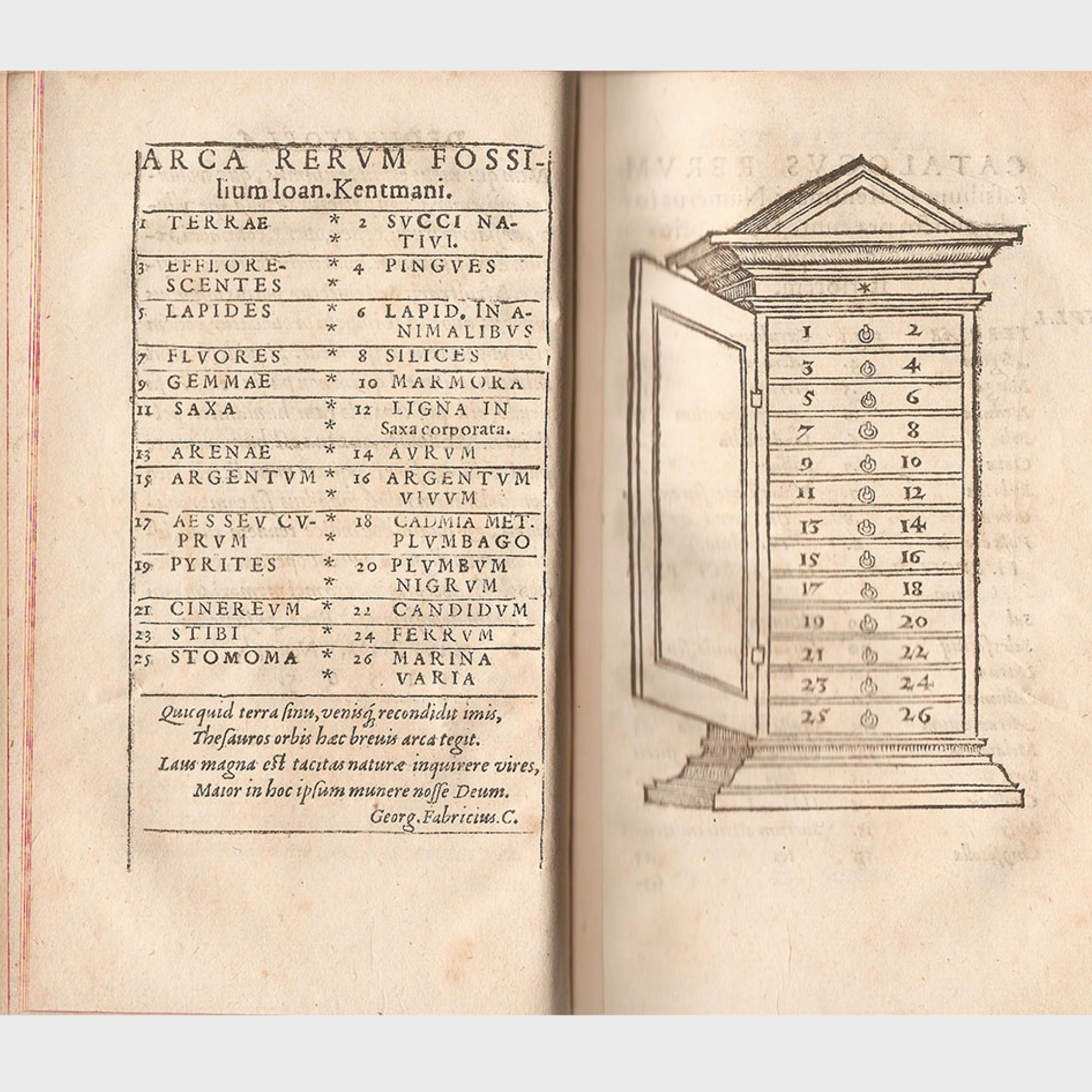 Johannes Kentmann (1518-1574) assembled a mineral collection of about 1,600 specimens from 135 locations, with emphasis on metallic and ore minerals from Saxony. Swiss polymath Conrad Gesner (1516-1565), a close scholarly friend of Kentmann, published two of Kentmann's treatises in his eight-part compendium De Omni Rerum Fossilium Genere. The first tract, Catalogus Rerum Fossilium, is recognised as the earliest known mineral collection catalogue. In his dedication to Gessner, Kentmann notes that he had "amassed a collection of [mineral] treasures at great expense". His detailed inventory of 1,608 specimens (1,136 from Saxony, 472 from foreign localities) represents the first documented mineral collection in history. It also provides the earliest depiction of a collection cabinet: Kentmann's orderly mineral cabinet, illustrated with 13 drawers, organises specimens into 26 categories (Wilson, 1994). This woodcut symbolises the early stages of modern mineral collecting and has been reproduced widely in scholarly publications, becoming iconic of Renaissance collection displays alongside later Wunderkammer illustrations.