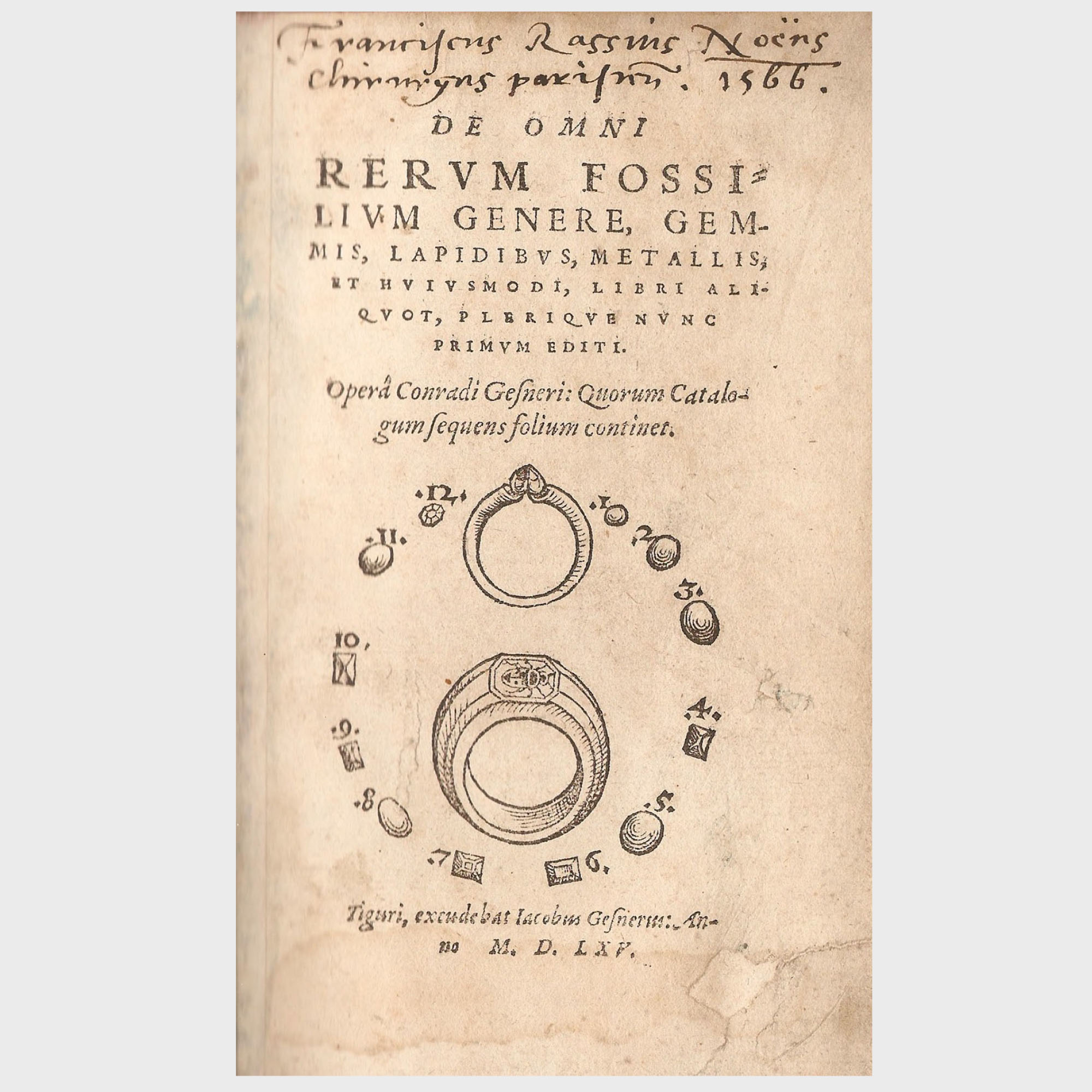 Description: Modern binding, red edges. Stand-alone collection catalogue, including the title page of De Omni Rervm Fossilivm Genere (repaired at bottom corner) and the 2-pp. table of contents describing the eight parts. Inscription on title page: "Franciscus Rassius Noëns chirurgus paxifrinsis, 1566". According to Schuh (Schuh, C.P., Annotated Bio-Bibliography of Mineralogy and Crystallography 1469-1919, unpublished), its printing history is a difficult bibliographic problem: Each of the included works is known to exist as its own separate volume, while complete collections of these tracts are a rarity, suggesting that they were assembled by the publisher from the remaining stock of the various treatises.
