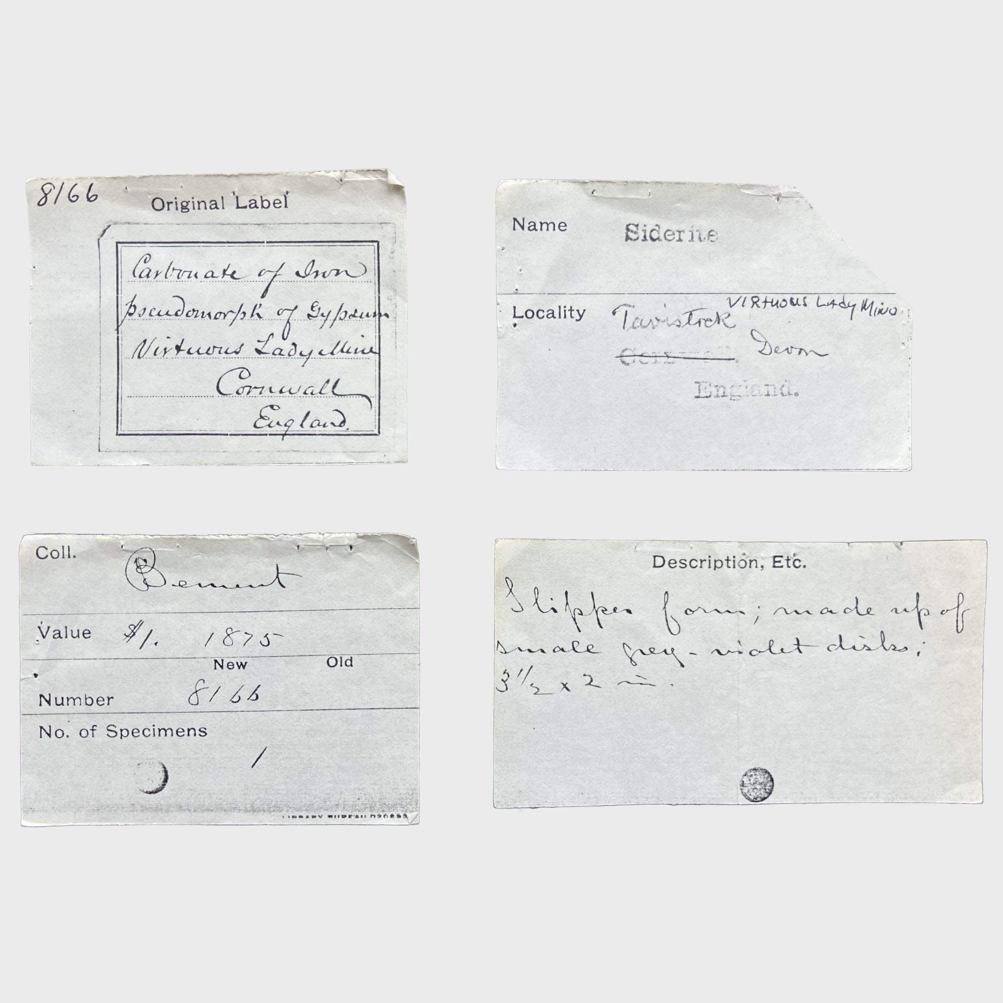 was part of the private collection of curator R. T. Gunther. He noticed "a good series of Cornish minerals presented by