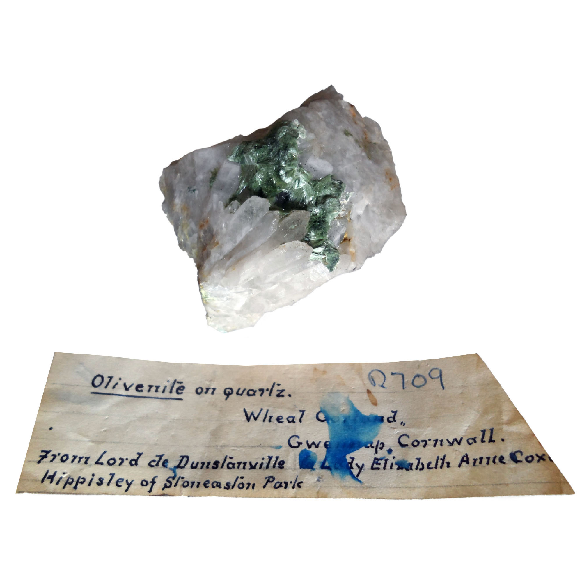 "Olivenite on quartz. Wheal Gorland, Gwennap, Cornwall. From Lord de Dunstanville to Lady Elizabeth Anne C. Hippisley of Stoneaston Park". We