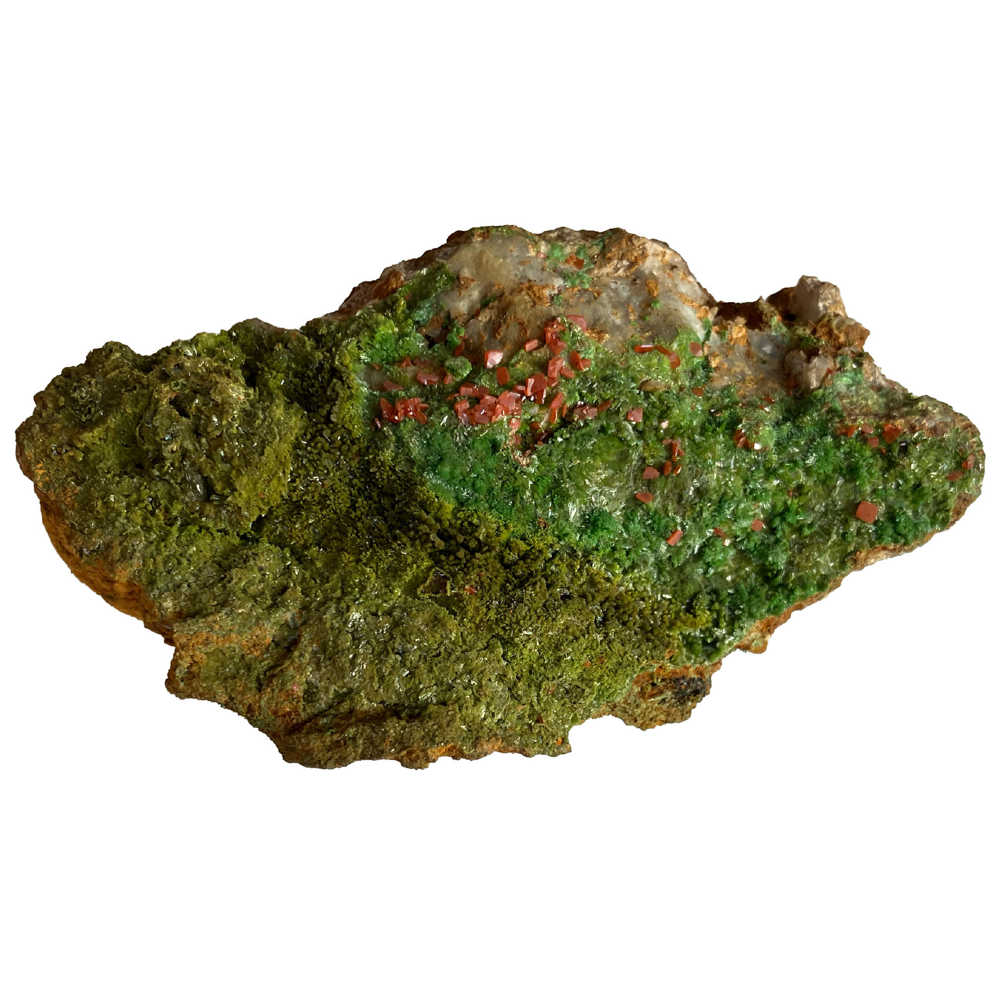 Description: Specimen hosting a rich showing of olive green Olivenite (acicular crystals that exhibit an almost 'hairy' appearance)