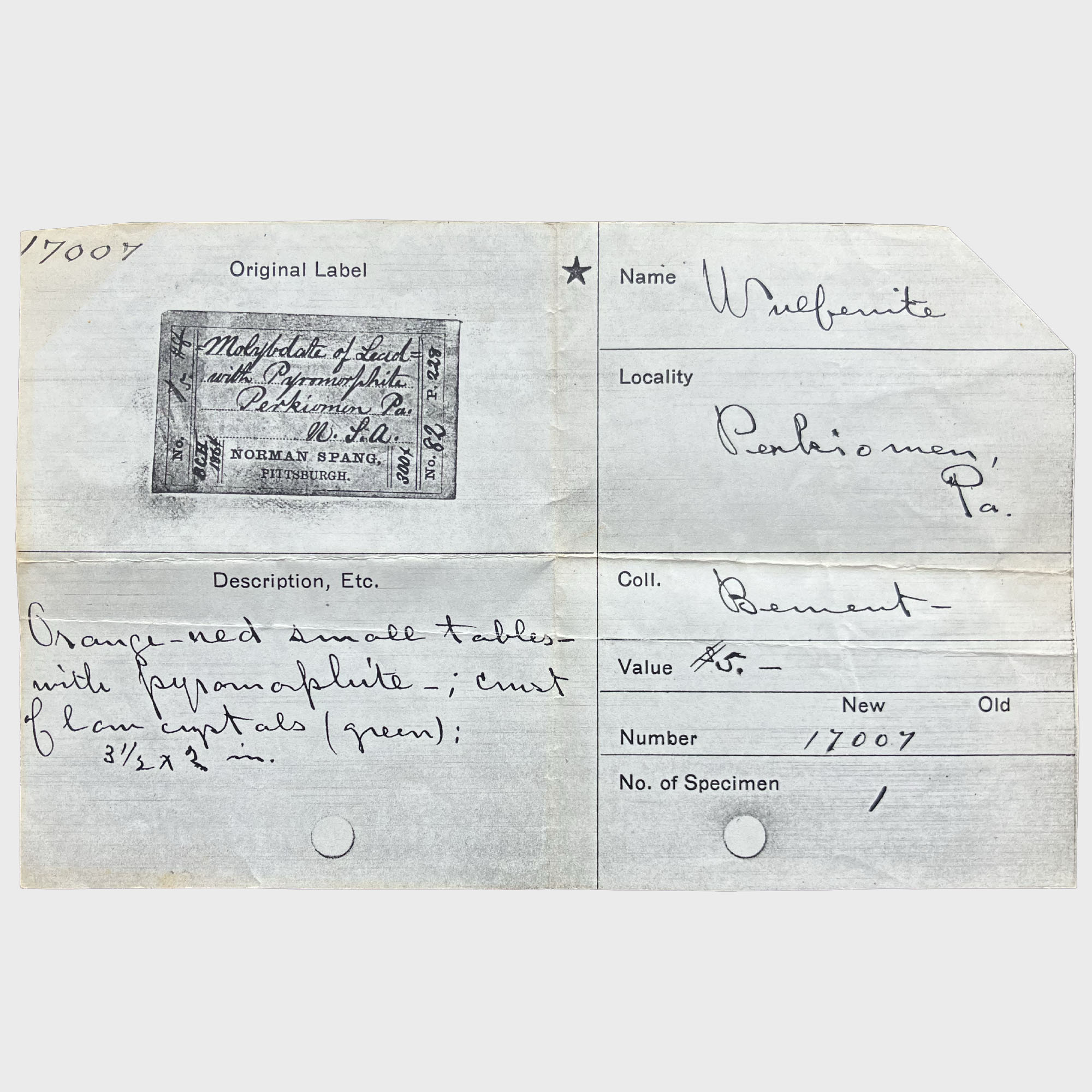 that C.S. Bement acquired the specimen from Norman Spang in 1864. Carries on the back the AMNH painted number 17007 and an older glued sticker