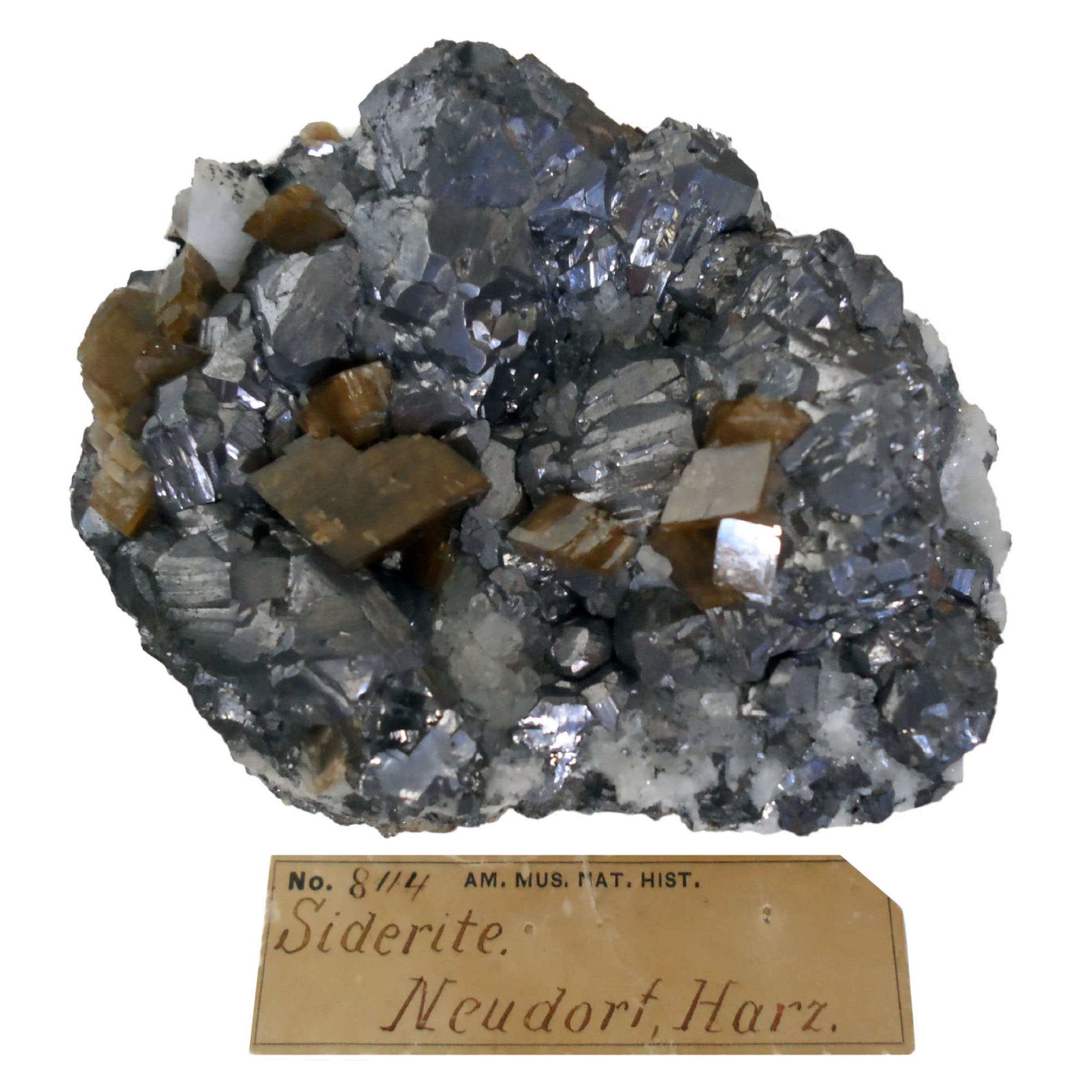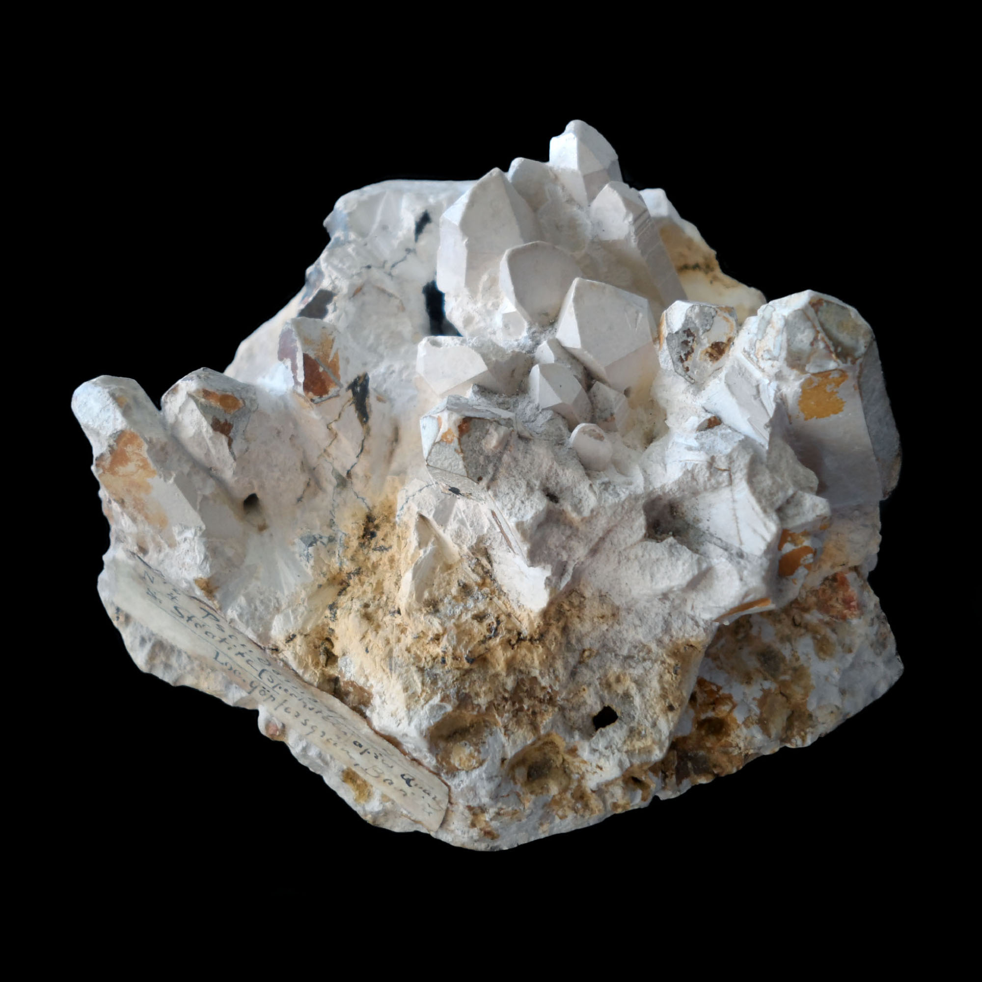 matrix of white Quartz (including tiny Quartz crystals in vugs) and limonitic gossan. The accompagning AMNH index card photocopy indicates