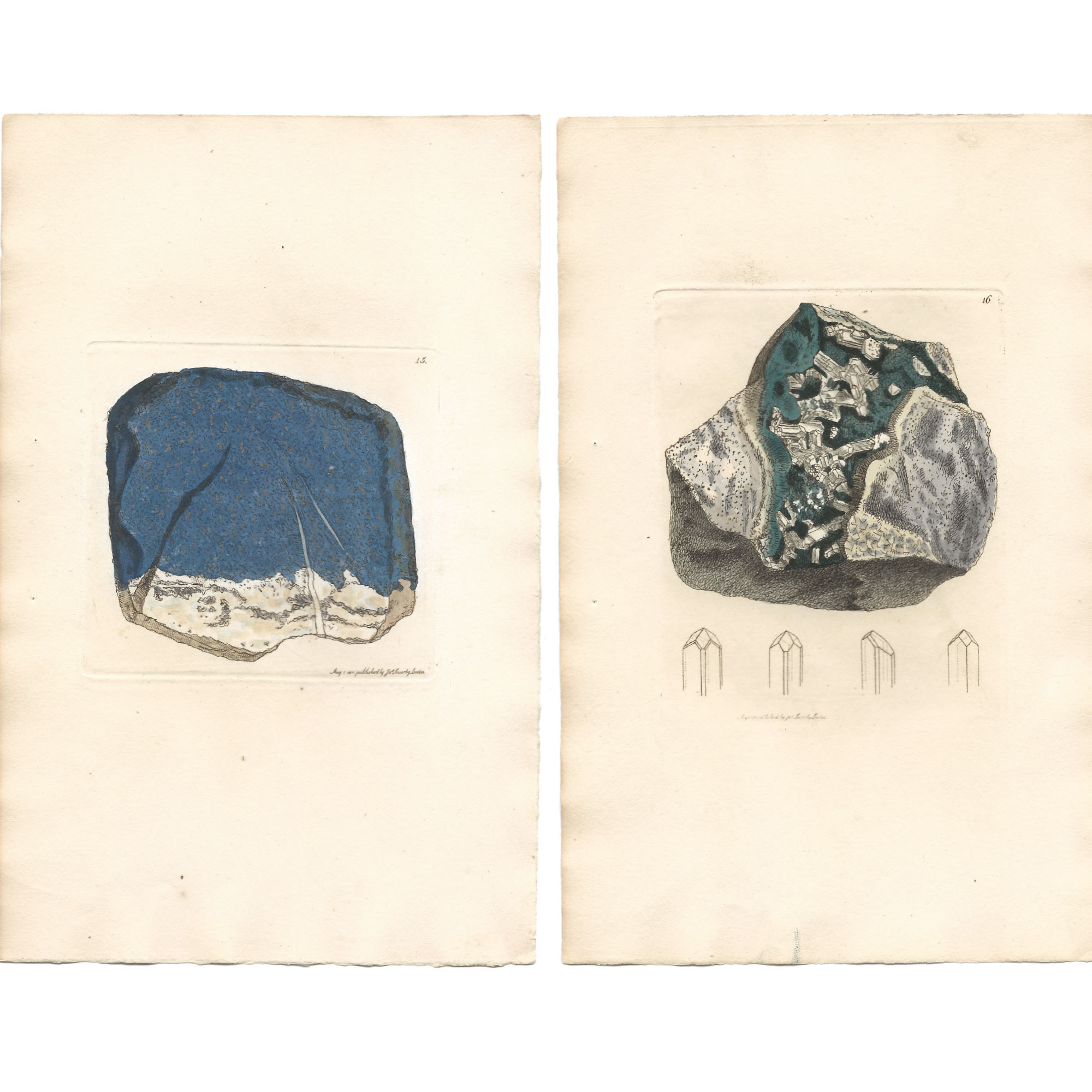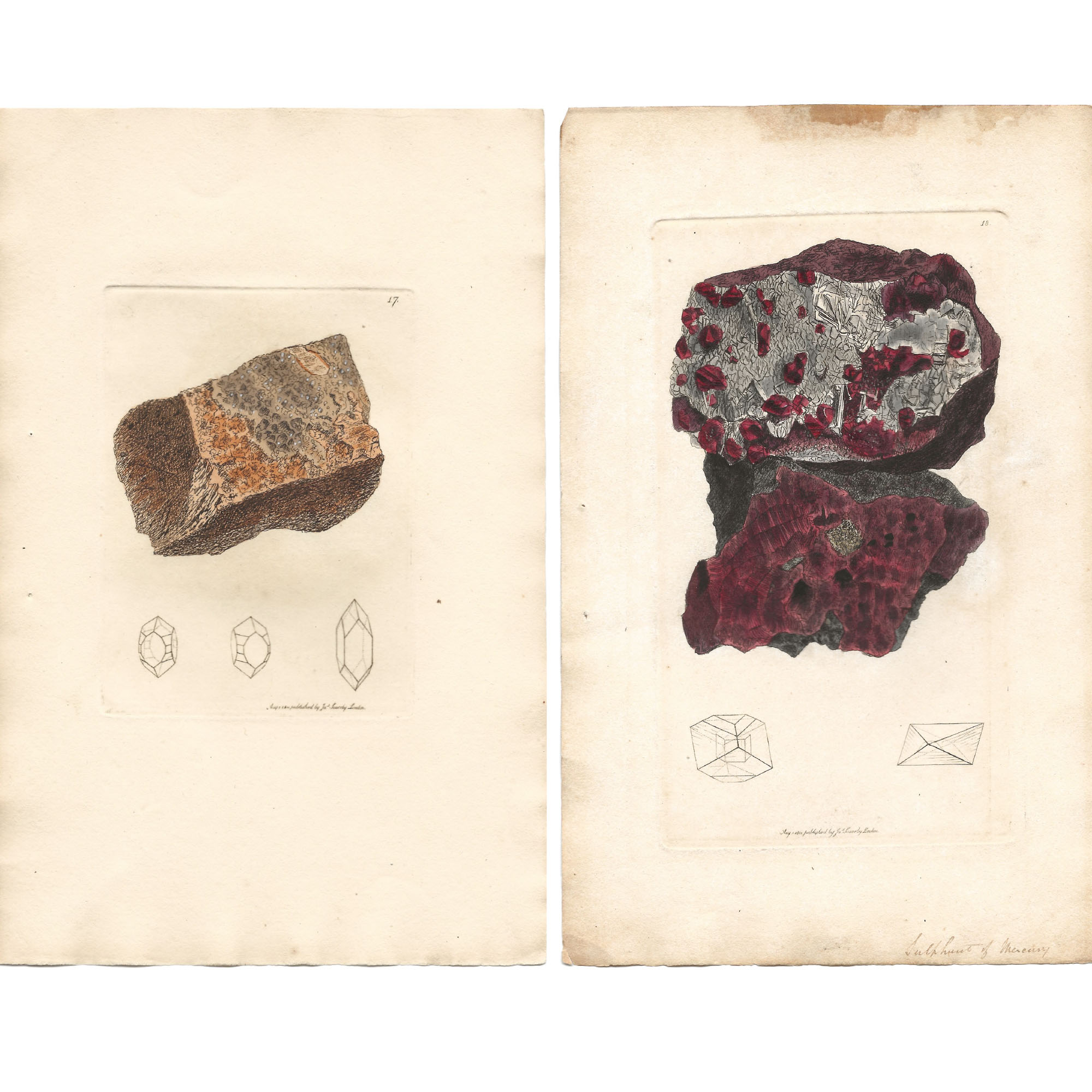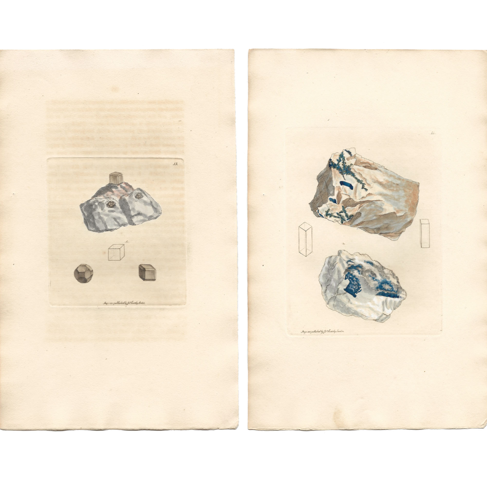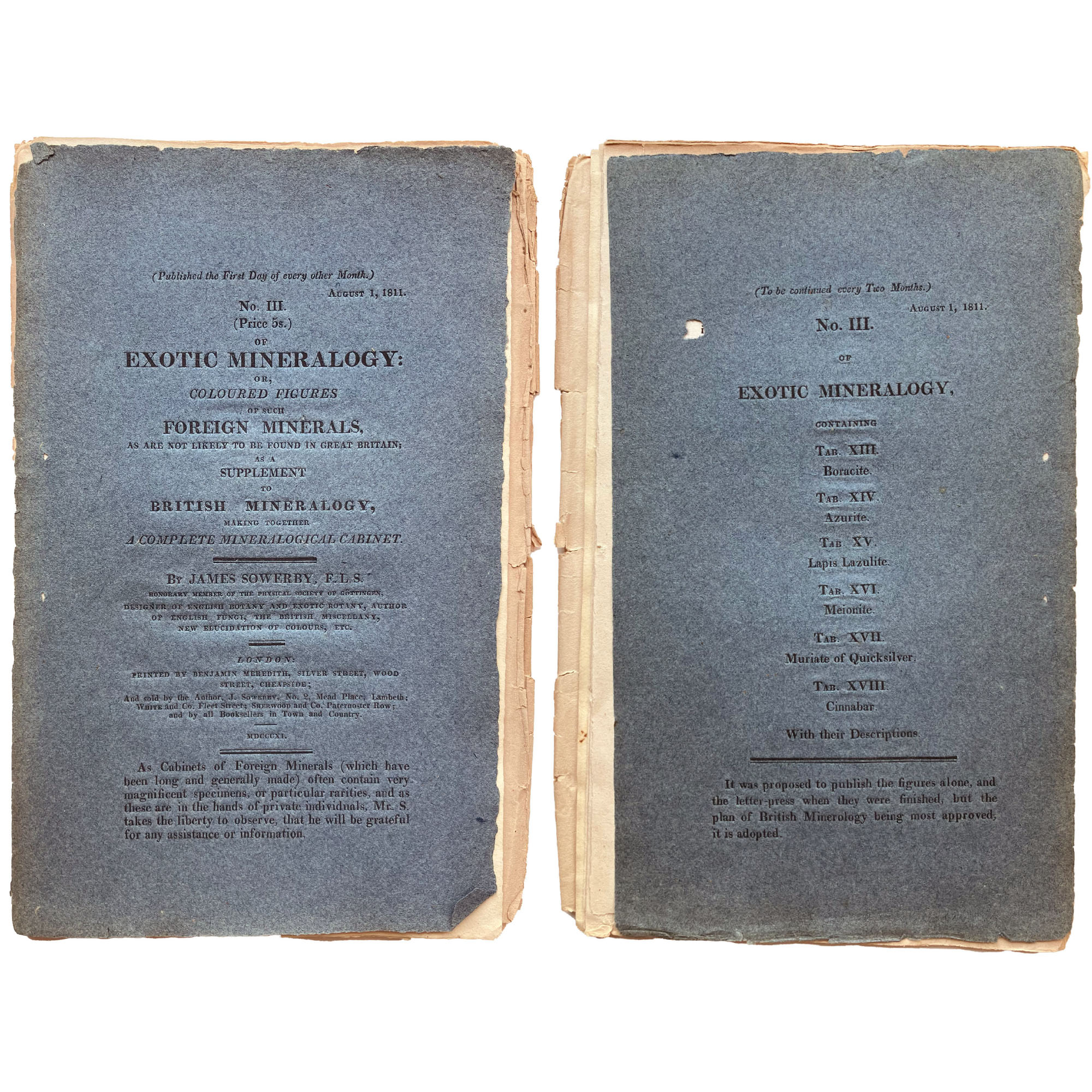 Description: Complete bi-monthly part no. III with the wrappers, six plates (XIII-XVIII), and fourteen pages of text (pp. 25-38). One out of 28 parts composing Exotic Mineralogy. Believed to be in almost original state, as originally issued with stab holes from the original stitching of the part. Describes the following six minerals: Boracite (Tab. XIII), Azurite (Tab. XIV), Lapis Lazulite (Tab. XV), Meionite (Tab. XVI), Muriate of Quicksilver (Tab. XVII) and Cinnabar (Tab. XVIII). James Sowerby personally engraved and etched the copperplates used to produce his Mineralogies. They were based on his own drawings of specimens that he owned or that were lend by other collectors. Once the copperplate-engraved outline was printed, usually in black ink on an octavo-sized sheet of paper, it was then hand-tinted within the printed outlines using watercolour paints. This was realised by James Sowerby himself, some family member or employee (Conklin, 1995:87). It can be added that all plates are reverse images of the actual specimens.