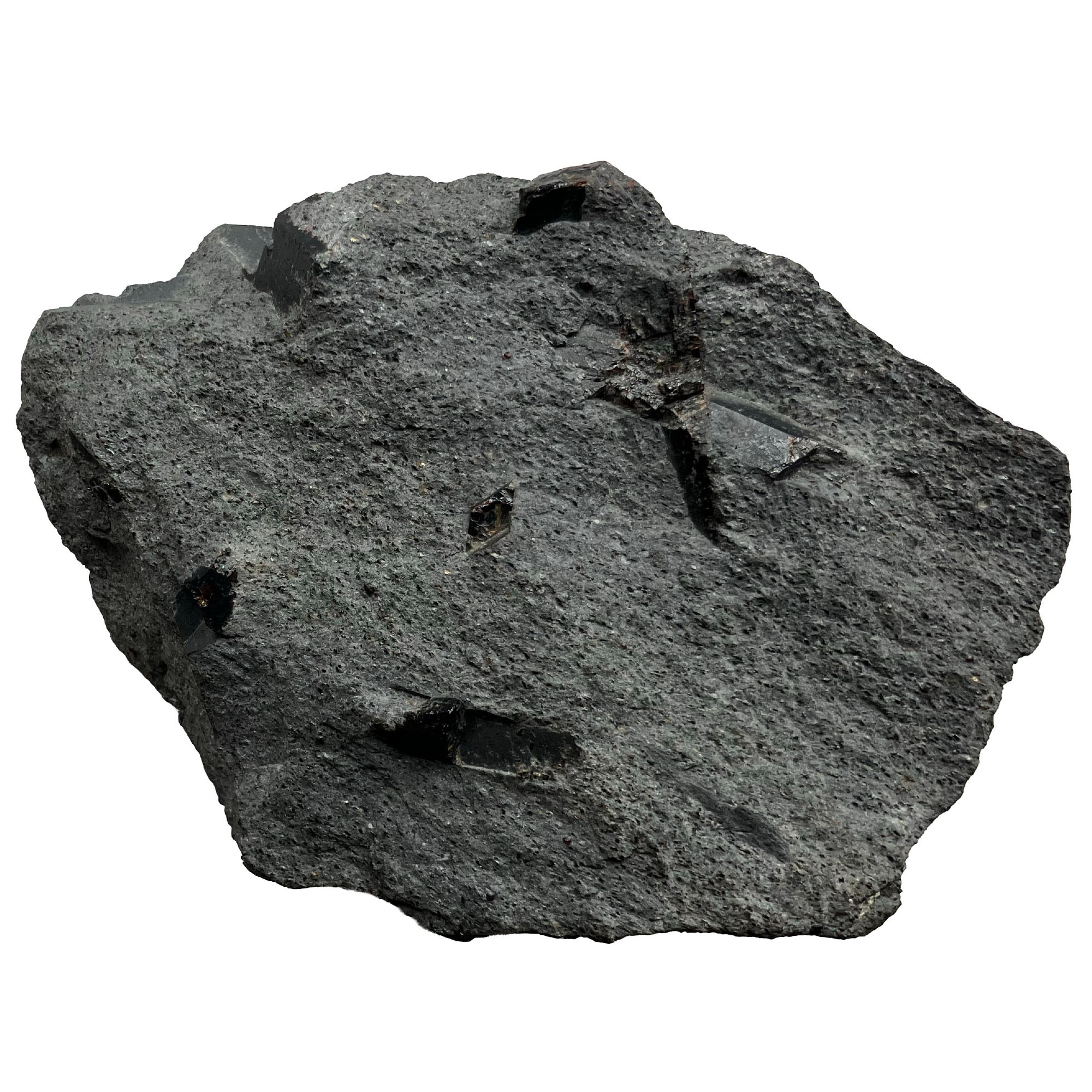 Description: Well developed black crystals of Cassiterite with a brilliant lustre, ranging between 4 and 8 mm, together with small,