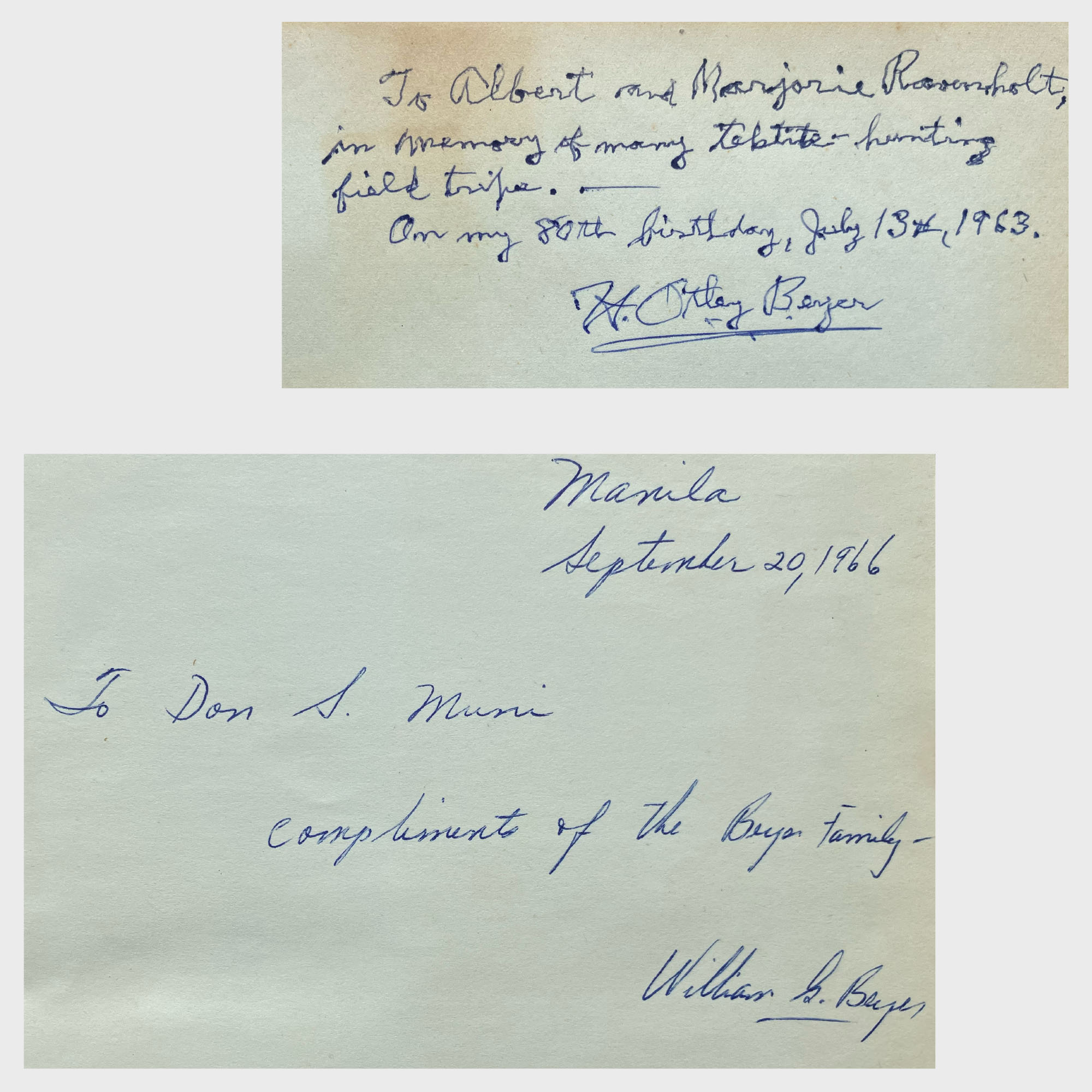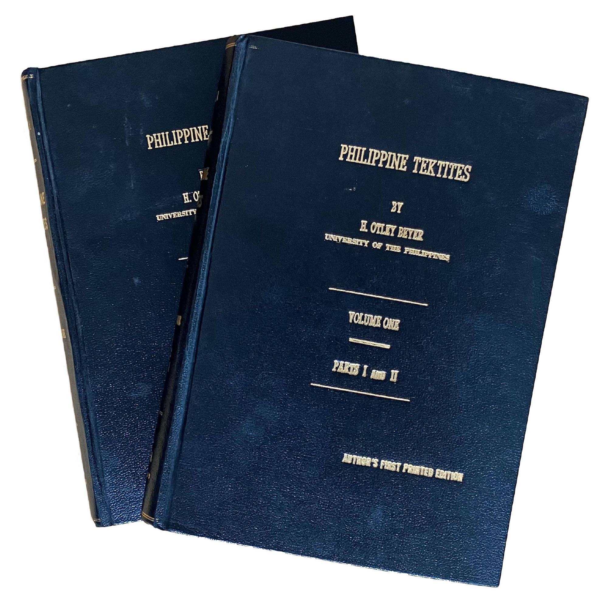 Description: Philippine Tektites, A Contribution to the Study of the Tektite Problem in General, in the light of both, Past and Recent Discoveries. Univ. Philippines Publ. In Nat. Hist., Quezon City and Manila, Vol. 1, Parts I and II, 290 pp., 43 pls. - Black leather binding with gilt title, identical for both presentation copies: (i) Inscribed by H.O. Beyer: "To Albert and Marjorie Rosenholt, in memory of many tektite-hunting field trips. - On my 80th birthday, July 13th, 1963, H. Otley Beyer"; (ii) Inscribed by H.O. Beyer's son: "Manila | September 20, 1966 | To Don S. Muni | compliments of the Beyer Family - | William B. Beyer" (dated only three months before H.O. Beyer's death). A softcover version exists suggesting that the bound copies were prepared by the Beyer family specially for presentation purposes (softcover front and back have been preserved and bound into the rear of our first copy). Beyer's life-long work on Philippinites is compiled in this large two-part monograph which includes most of his papers but also several collection catalogues, such as: ‘Appendix A. List of Bikol Tektites collected prior to August 1st, 1938’. When the specimen is not found by Beyer himself, the name of the collector is given (see also appendix B-C). Other catalogues include ‘List of tektites found in the course of our Rizal Province archaeological survey (1926-1932)’ and ‘Preliminary catalogue and accession-list of the Kalamian Tektite Collection’. It is to be noted that Beyer was preparing a second volume with parts III and IV but he passed away before this project could be finalised.