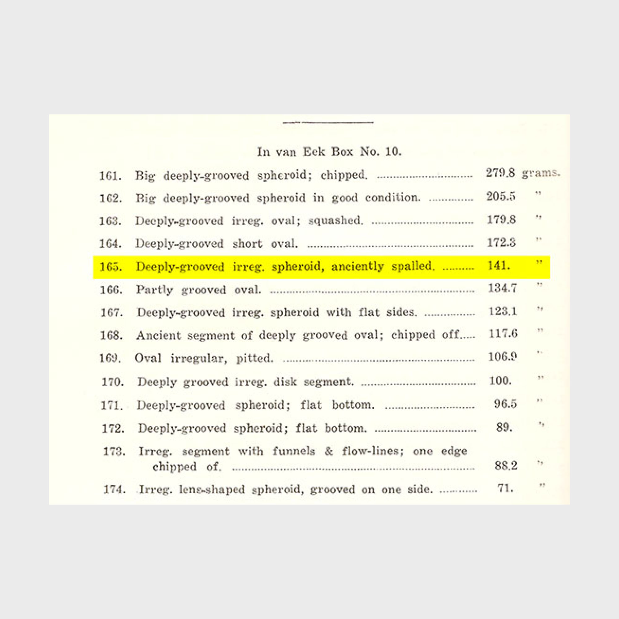 spheroid, anciently spalled", inventory number 165, "van Eek Box No10". We learn from pp. 154-155: "Notes on 1940: