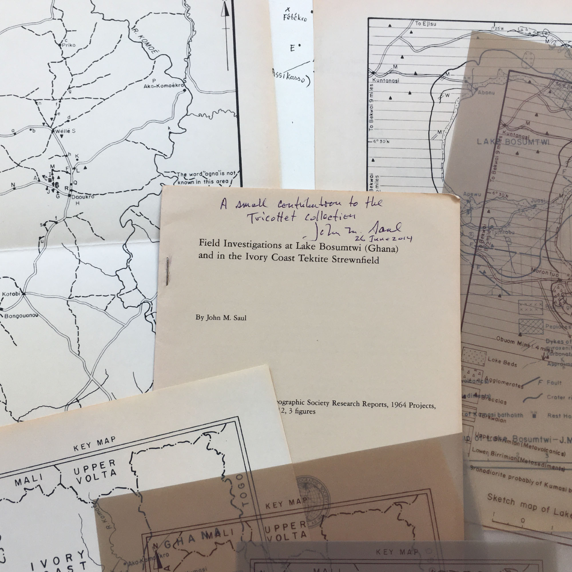 - Saul, J.M. (1969), Field Investigations at Lake Bosumtwi (Ghana) and in the Ivory Coast Tektite Strewnfield. National Geographic Society Research Reports, 1964 Projects, 201-212 [in coll.: Inscribed by the author, with proof plates]
