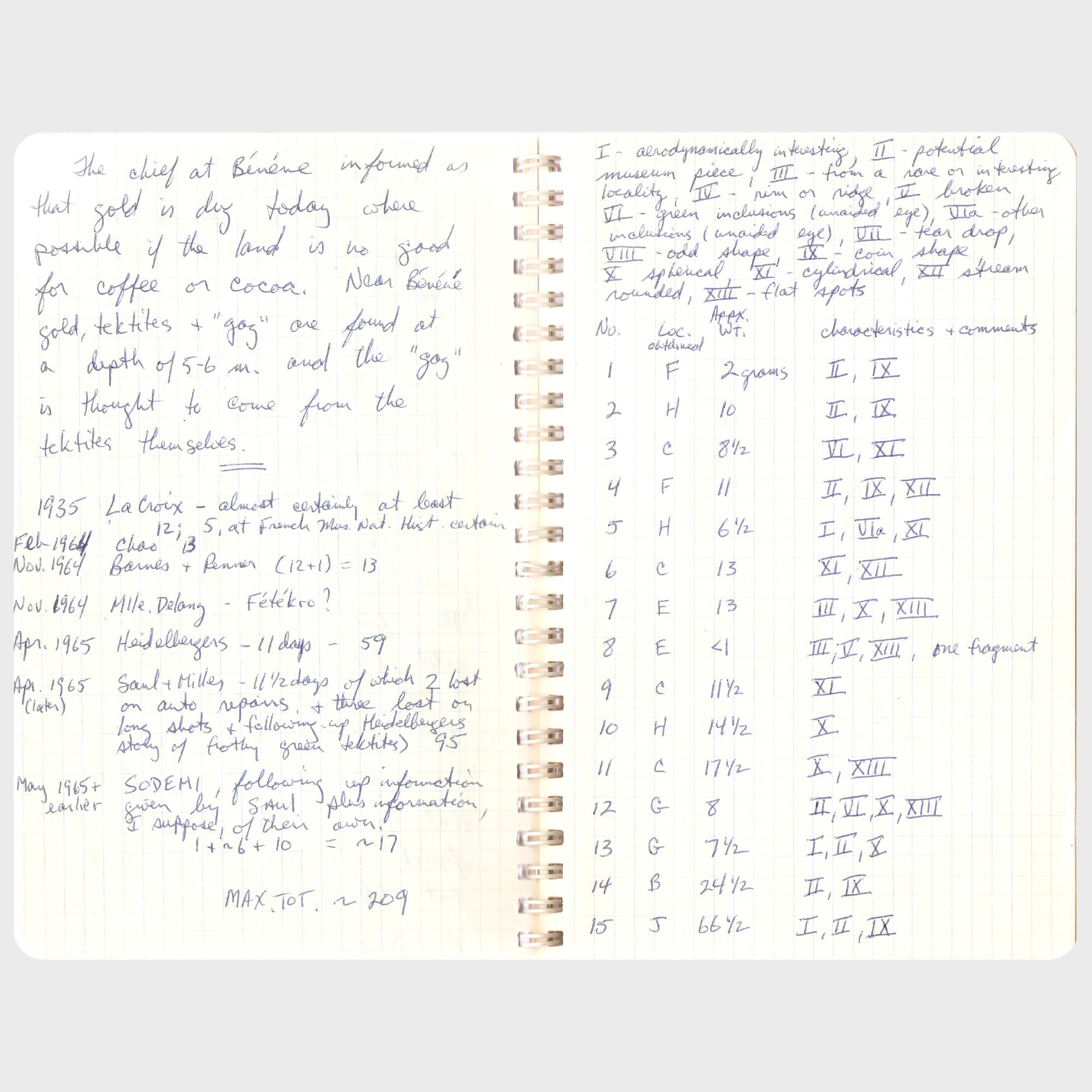 number of specimens (95). As of the writing of his field notes, John Saul counted a total of 209 Ivory Coast tektites