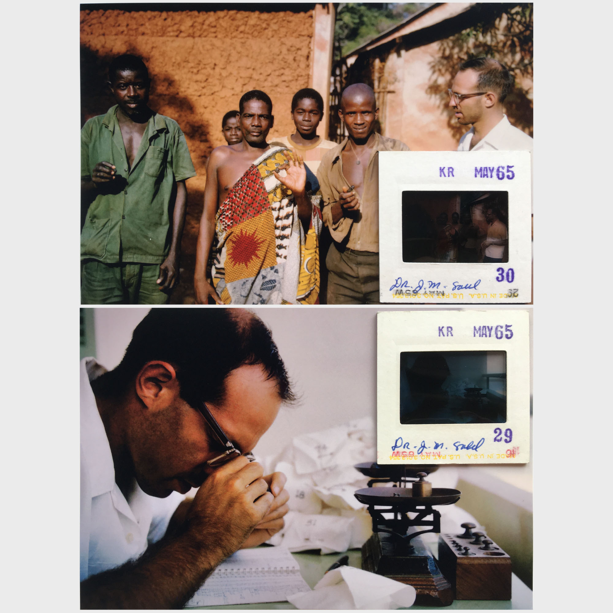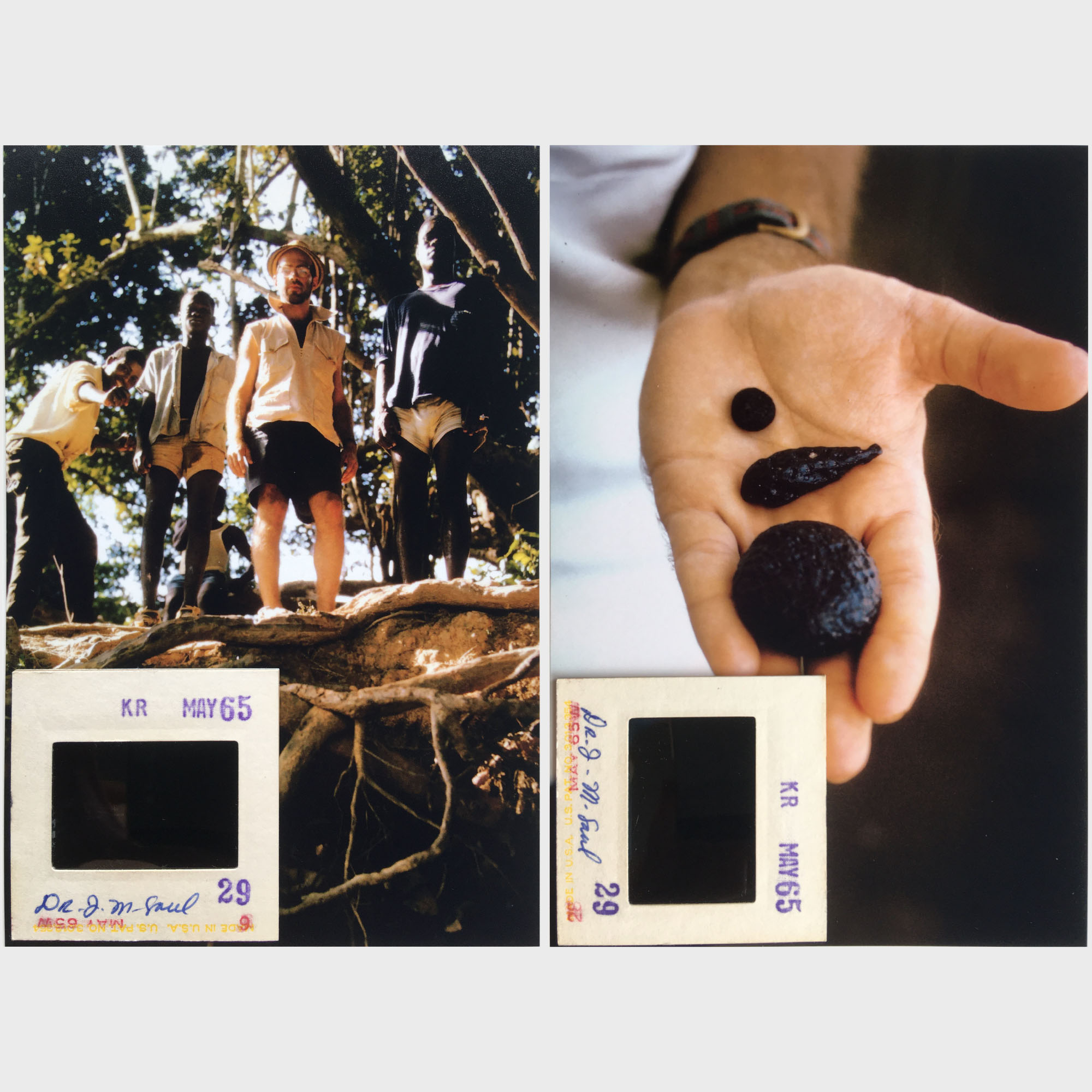 Description: A collection of 9 photographs taken during the 1965 expedition in the Ivory Coast tektite strewn field. Kodrachrome 35mm slides (positive transparencies), with penned notes and stamp-dated May 1965. The photographs were taken by John Saul and his collaborator Elliott White Miller. The set includes a photograph of John Saul standing over gold diggings from which tektites were found (west of road to Daoukro), four photographs of him talking to crowds to explain what he was looking for, one picture of his open hand with three of the best tektites (perhaps taken back in Abidjan), and three photographs of John Saul inside a modern building, likely in Abidjan, weighing (on a pan balance) and sorting tektites (pers. comm., J. Saul). The 2-pp. catalogue previously described can be seen on tow of the images! Regarding the photograph showing three men holding a tektite, John Saul confirmed to the TC that he at least purchased the specimen from the man directly next to him. Saul (1969:207) explains that tektites were found "when pits were dug in the alluvium for gold. This occupation was much more widespread in the 1930's before coffee growing and cocoa cultivation were introduced into the area." Interestingly, he adds that he and his colleague Elliott White Miller had been invited to see two such diggings, one located at Dadeikro No. 2 (locality C) and the other east of Kongoti (locality L), an example of which is shown the matching photograph.